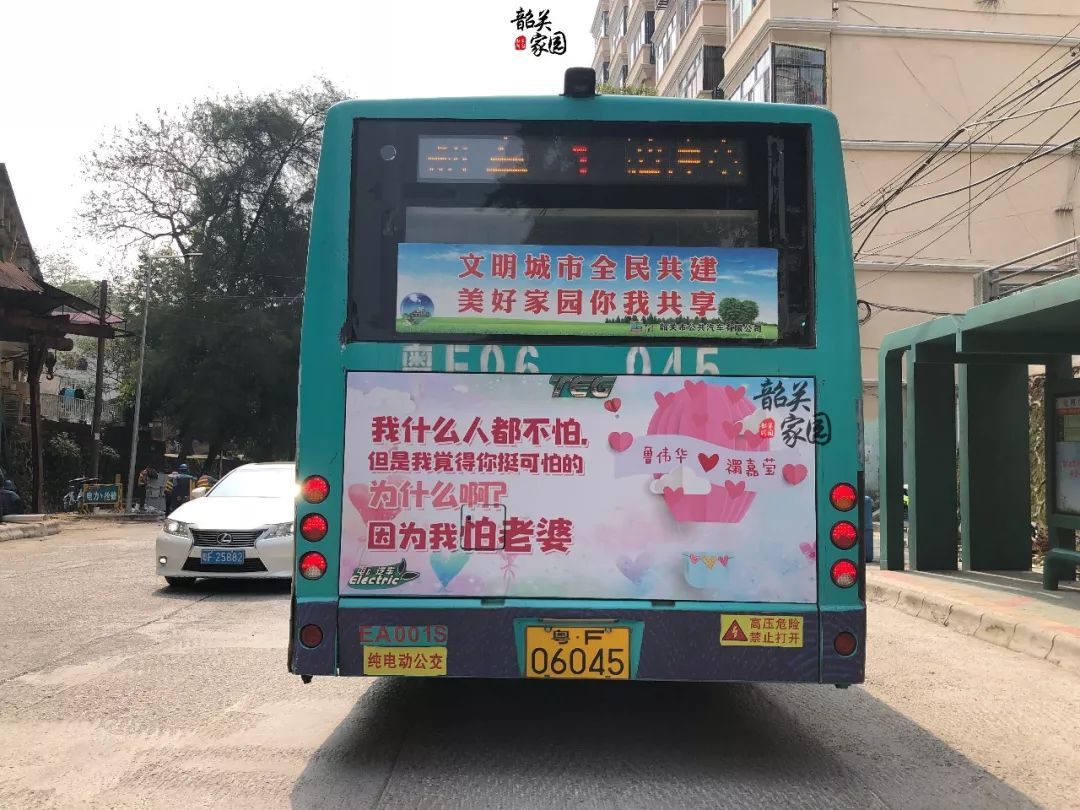 近日,家园君发现韶关部分公交车尾部,贴着一则大大的秀恩爱广告,看了之后那感觉真是妙不可言。。。